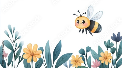 Cute Cartoon Bee Hovering Over Blooming Flowers in Lush Garden