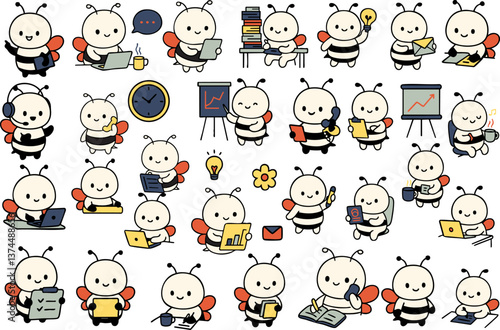 Cute cartoon bees engaging in various activities like working, studying, and communicating. Perfect for illustrating productivity and teamwork