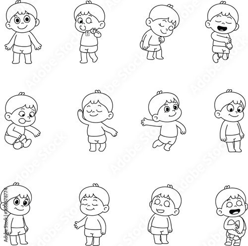 Cute cartoon boy character expressions, black and white line art, emotional kid poses, vector illustration set, outline children drawing
