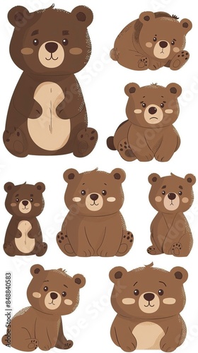 Cute cartoon brown bear cubs drawing set. Simple clip art illustration. Bear drawing