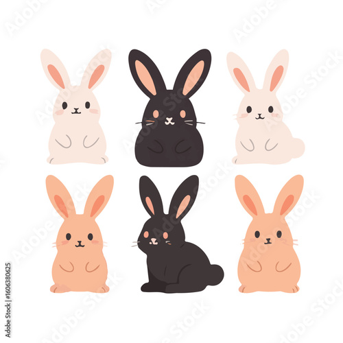 Cute cartoon bunnies in various colors sitting on a plain background. Adorable animal characters for children's products.