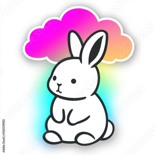 Cute Cartoon Bunny Rabbit Under a Rainbow Cloud