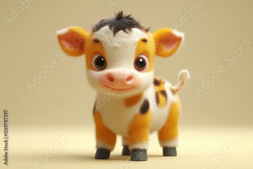 Cute cartoon calf with bright colors and large expressive eyes standing against a neutral background