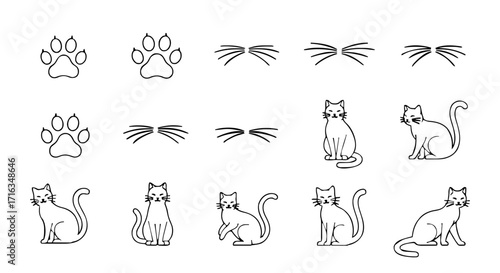 Cute cartoon cat set, colorful, outline, and silhoutette illustrations for pets and accessories