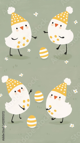Cute cartoon chicks wearing hats play with decorated eggs in cheerful scene