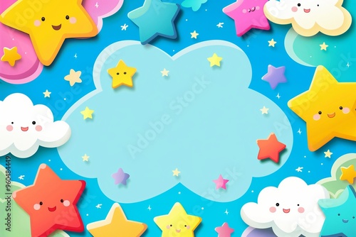 Cute cartoon cloud and star background with space for text, colorful stars, cute clouds, playful design illustration simple background