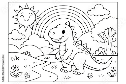 Cute Cartoon Dinosaur in a Sunny Landscape with Rainbow