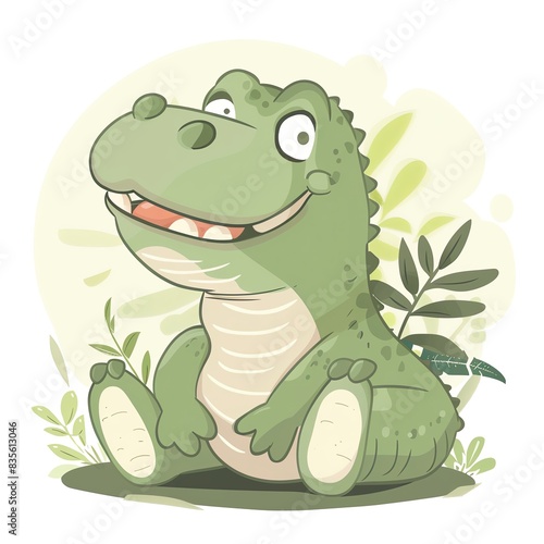 Cute cartoon dinosaur with a big smile sitting in the grass