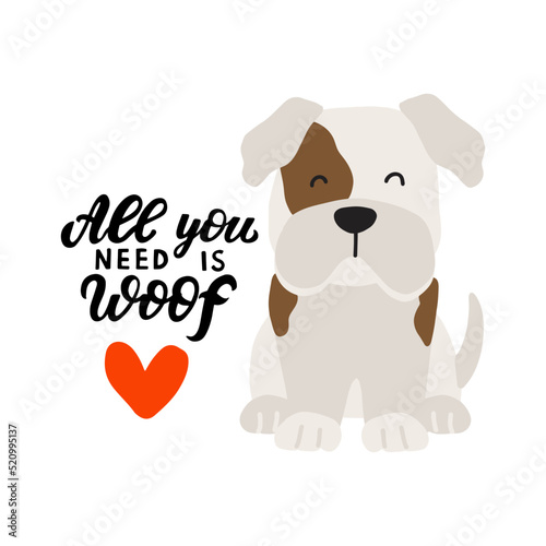 Cute cartoon dog. Bulldog Hand drawn dog face with hand lettering All you need is woof. Dog lover quote. Cartoon dog. Printable stickers design element. Vector illustration on white background