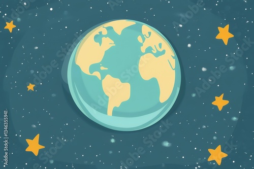 Cute Cartoon Earth Planet Space Stars Night Sky Design Fun Teal Blue Soft Flat Kids Image