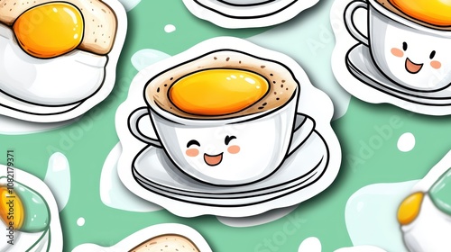 Cute Cartoon Egg in Coffee Cup Stickers Breakfast Food Illustration