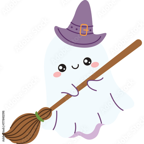 Cute cartoon ghost wearing a purple witch hat holding a broomstick with a happy expression and rosy cheeks against a transparent background a whimsical Halloween illustration