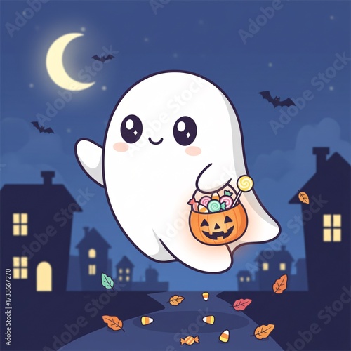 Cute Cartoon Ghost with Pumpkin Trick or Treat Illustration