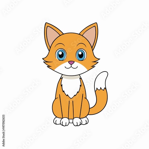 Cute cartoon ginger cat sitting with big blue eyes on white background