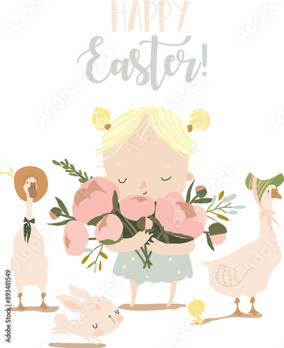 Cute Cartoon Girl with Floral Bouquet, Easter Rabbit and Gooses. Vector Illustration