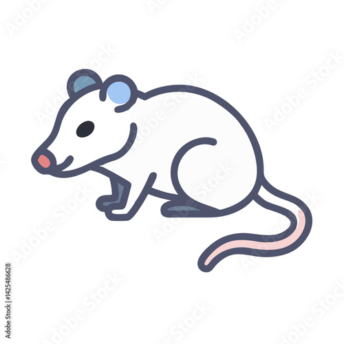 Cute cartoon illustration of a white mouse with blue ears and a pink tail sitting in a playful pose