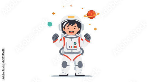 Cute cartoon kid astronaut character floating in space with planets and stars vector