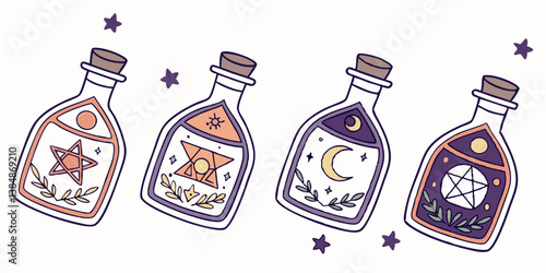 Cute Cartoon Magical Witchcraft Potions Bottles Sun Star Moon Pentagram Symbols Illustration