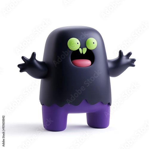 Cute cartoon monster with green eyes and purple legs, expressing surprise with open arms on a white background. Halloween Art Toy Character Design.