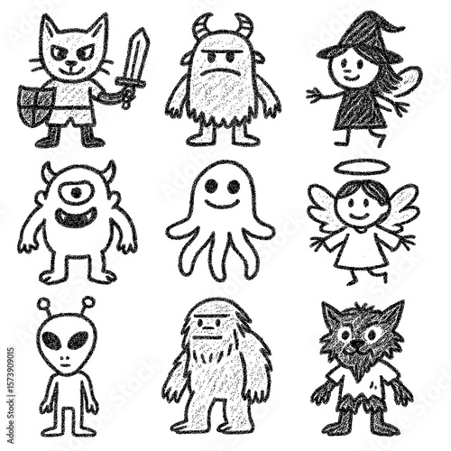 Cute cartoon monsters and germs in hand-drawn doodle style, Transparent Background