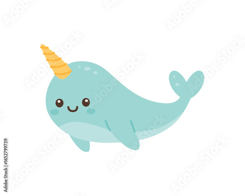 Cute cartoon narwhal with smiling face and yellow spiral tusk. Flat vector sea animal illustration for kids and marine themes