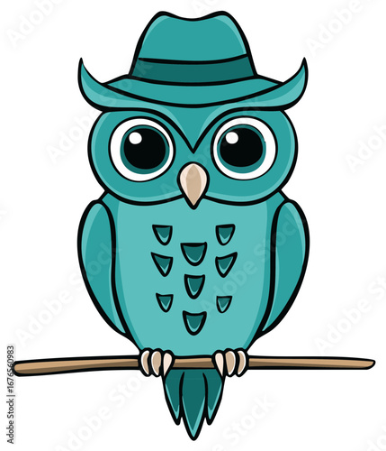 Cute cartoon owl wearing a stylish teal fedora hat sitting on a wooden branch