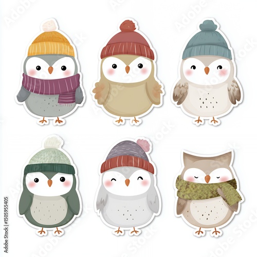 Cute Cartoon Owls Wearing Cozy Hats in a Cheerful Winter Setting