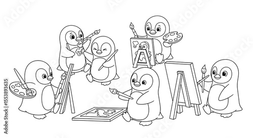 Cute cartoon penguins painting together with brushes and palettes isolated on transparent background