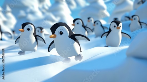 Cute Cartoon Penguins Playfully Waddling Across a Snowy Landscape