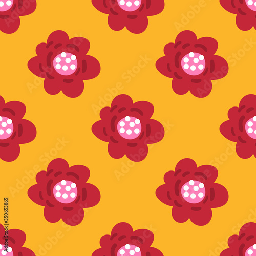 Cute cartoon polka dot flowers in flat style seamless pattern. Floral childlike style background. Vector illustration.