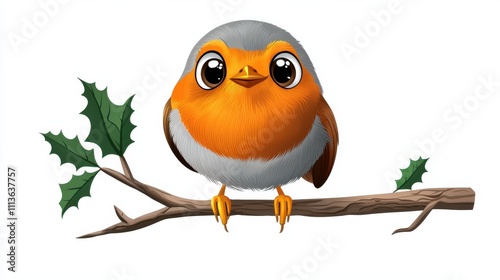 Cute Cartoon Robin Bird Perched on Holly Twig During Christmas Season