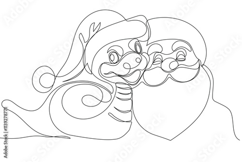 Cute cartoon Santa Claus and green snake stand next to the winter trees with Christmas gifts.. Cartoon Santa Claus with snake on blue background. Vector illustration