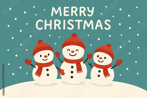 Cute Cartoon Snowmen Waving in Snow with Merry Christmas Greeting