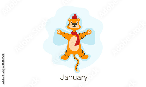 Cute cartoon tiger making a snow angel. Chinese symbol. Creative card design, Illustration for congratulations, stickers, pins, Calendar 2022, January