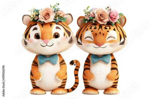 Cute cartoon tigers with floral crowns and bow ties, smiling happily