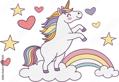 Cute cartoon vector of a unicorn standing on a cloud with rainbow, stars, and hearts, perfect for magical children's designs, nursery prints, and fantasy-themed decorations