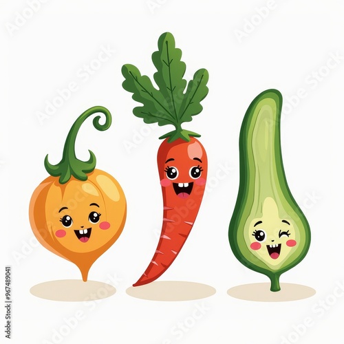 Cute Cartoon Vegetables Illustration with Happy Faces | Smiling Carrot, Zucchini, and Tomato Characters for Children's Educational Materials and Healthy Eating Campaigns