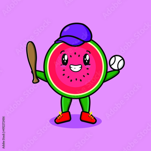 Cute cartoon watermelon character playing baseball in modern style design