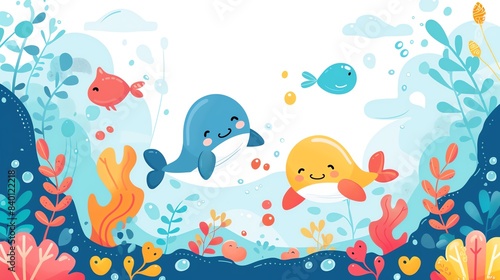 Cute cartoon whales and fish swimming in the ocean with coral reefs.