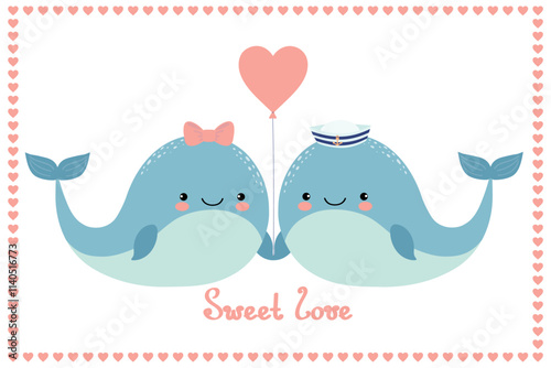 Cute cartoon whales couple. Male and female whales with balloon and lettering. St. Valentine's Day greeting card.