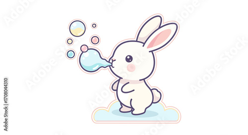 Cute cartoon white bunny rabbit blowing bubbles, adorable illustration for childrens books and easter celebrations, whimsical and playful design