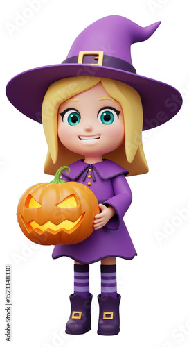 Cute Cartoon Witch Girl Holding Halloween Pumpkin Transparent Background
