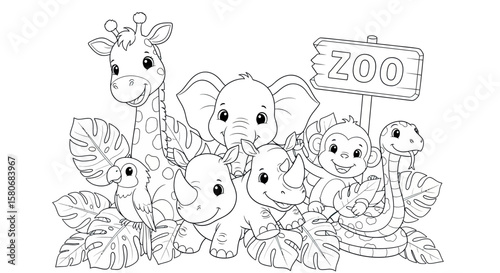 Cute Cartoon Zoo Animals Group Including Giraffe Elephant Rhino Monkey and Snake with Tropical Leaves