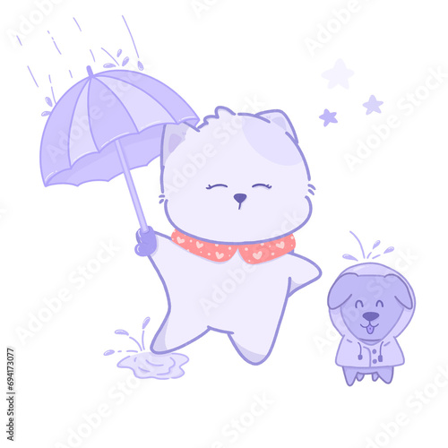 Cute cat and dog cartoon with umbrella and wear a raincoat when raining PNG