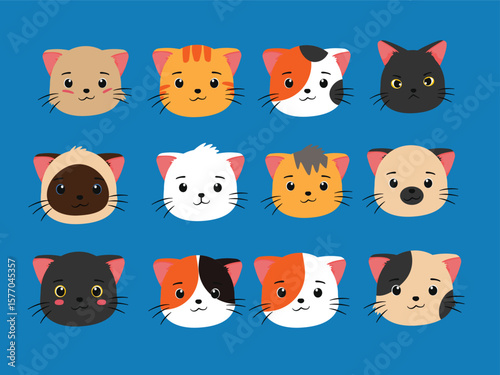 Cute Cat Heads Collection from Various Breeds in Chibi Kids Illustration Style