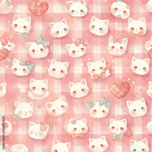 Cute Cat Pattern Design with Hearts and Bows on Soft Pink Background