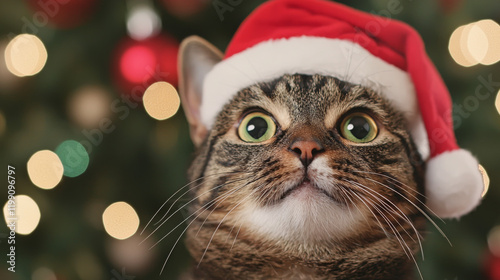 Cute cat wearing Santa hat celebrates Christmas with festive spirit