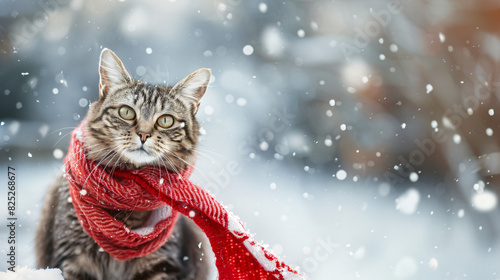 Cute cat wearing warm red knitted scarfs and hats sitting and snuggling next to each other on winter day during heavy winter snowfall