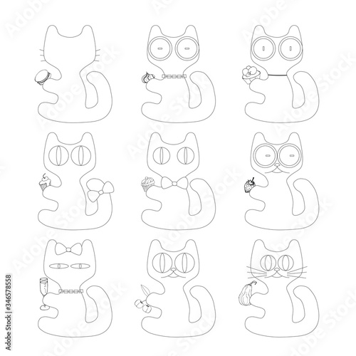 Cute cat with food doodle series, avatars, sketch line style icons. Flat animals, logo, cats set. Pets character cats handmade to print cat T-shirts. Vector illustration cats