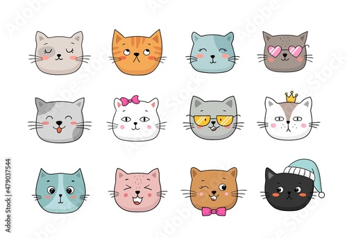 Cute cats faces set. Collection of cartoon animals isolated on a white background. Hand-drawn vector illustration.
